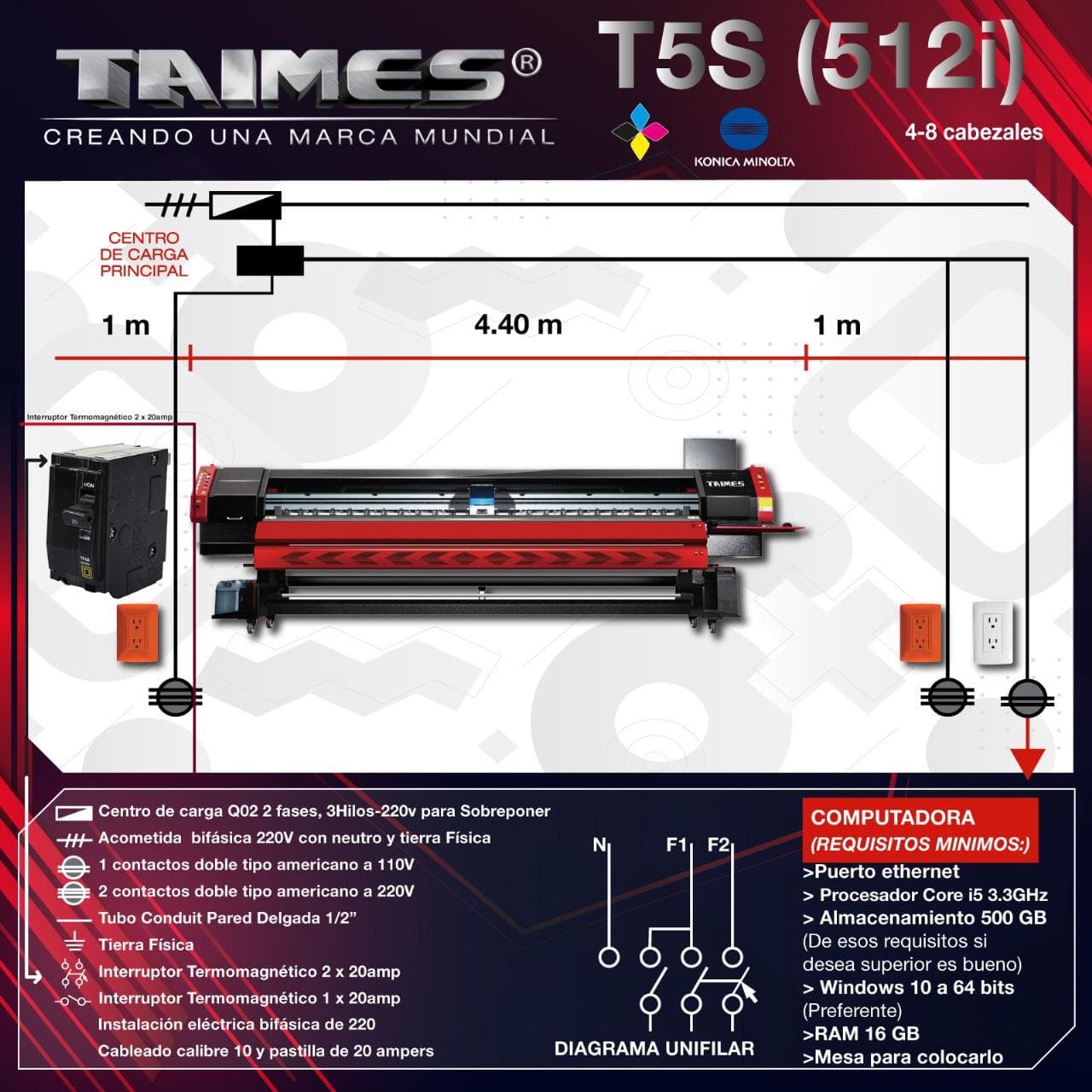 La TAIMES T5S (512i) ofrece impresión de alta velocidad y precisión con tecnología de 4 a 8 cabezales Konica Minolta 512i. Con un ancho de impresión de 3.20 m y compatibilidad con tintas solventes CMYK, es ideal para materiales como lona, vinil, mesh y translúcidos. Su estructura robusta, sistema de alimentación precisa y control térmico estable garantizan resultados consistentes incluso en largas jornadas de trabajo.