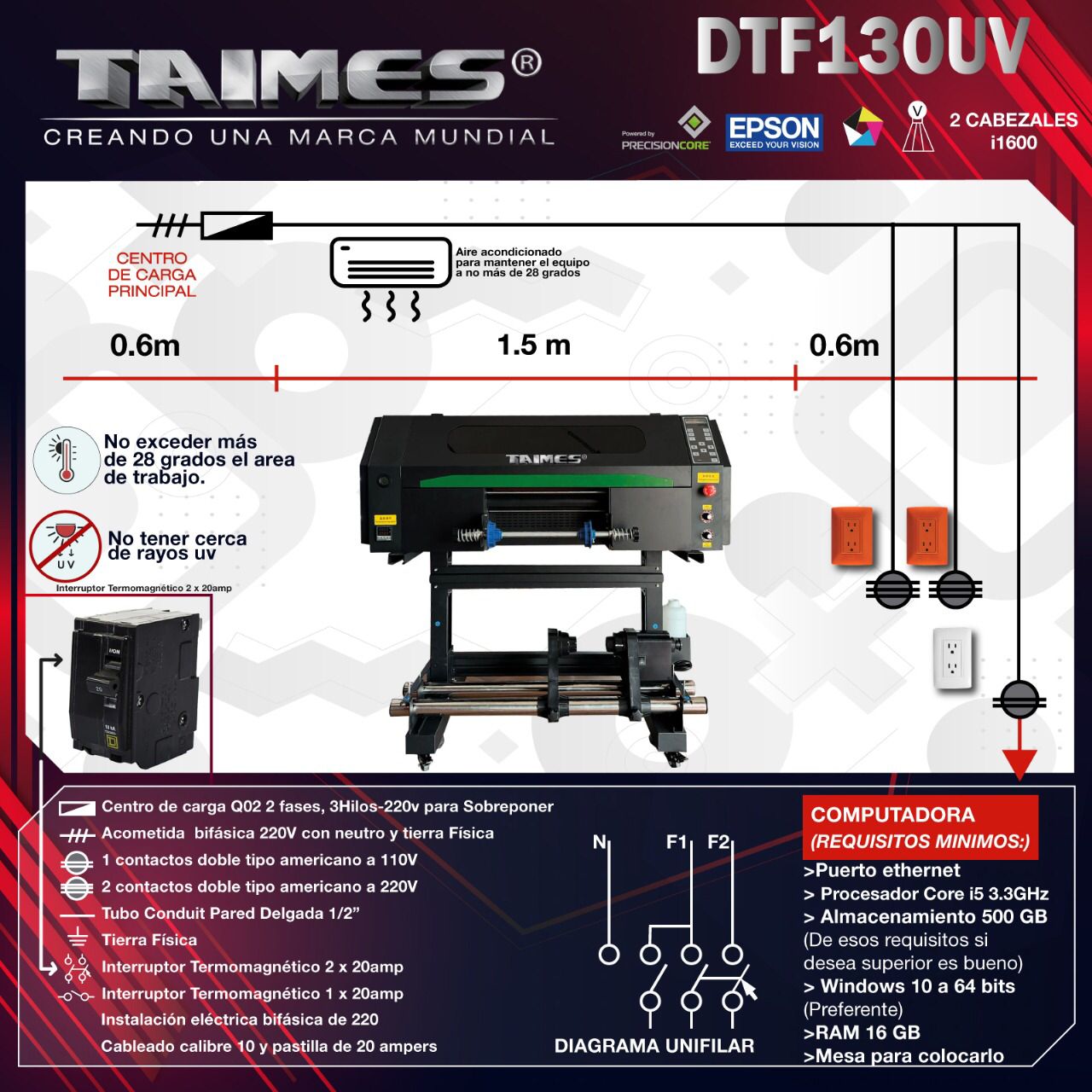 La TAIMES DTF130UV está equipada con dos cabezales Epson i1600-U1 y tecnología DTF UV, diseñada para ofrecer impresiones precisas y de alta calidad sobre una amplia variedad de superficies. Con un ancho máximo de impresión de 28 cm y tintas CMYK, blanco y barniz, permite obtener acabados durables y de alto impacto visual. Su sistema de succión, control de tinta y alimentación estable garantizan un funcionamiento confiable, ideal para aplicaciones en madera, plástico, cerámica, acrílico y aluminio.